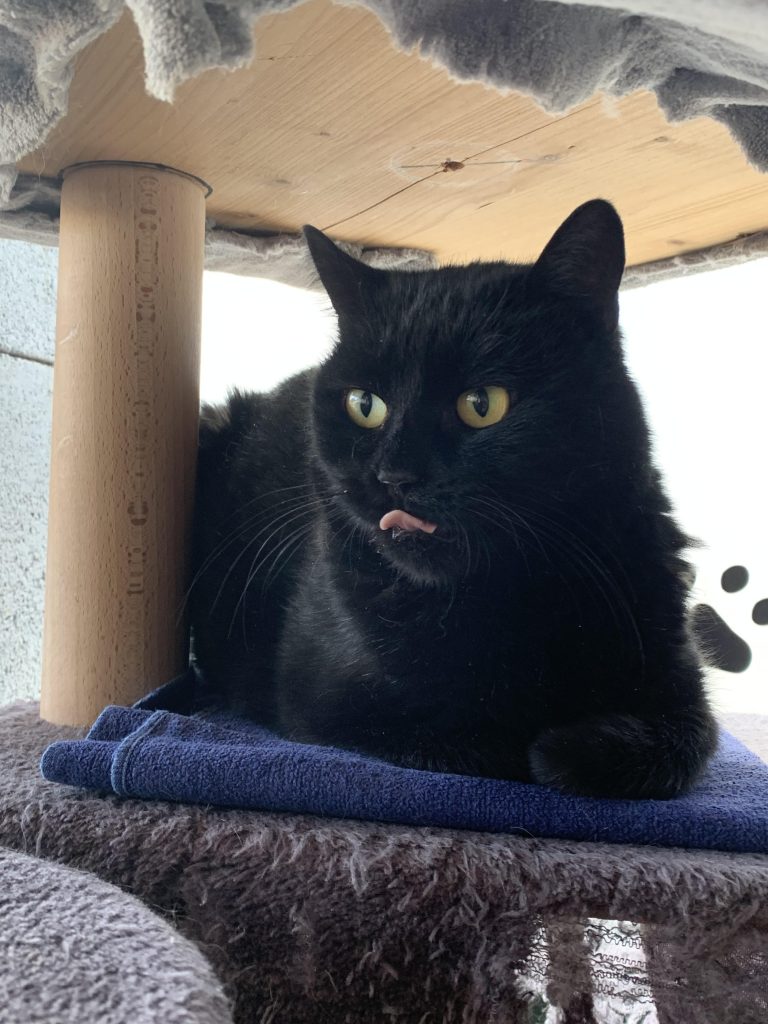 Elle s’est frottée directement aux autres chats donc si vous avez un matou en demande de compagnie, elle sera ravie.